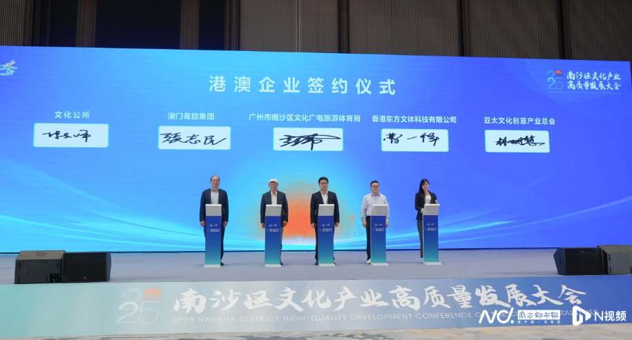 本次大会签约项目及企业达50余个,覆盖滨海度假、数字电商、演艺赛事等多个领域。其中,港澳企业的深度参与尤为引人注目,澳门青旅集团、亚太文化创意产业总会、文化公所(澳门)、香港东方文体4家港澳机构集体与南沙签约,进一步深化粤港澳文化产业协同创新。
