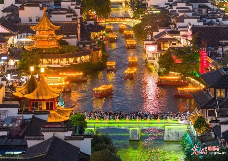2025年8月3日,游客在南京市夫子庙景区游玩。游客或乘船游览,或驻足观赏,或品尝美食,或挑选特色商品,沉浸式感受独特的江南水乡魅力,点燃城市“夜经济”。