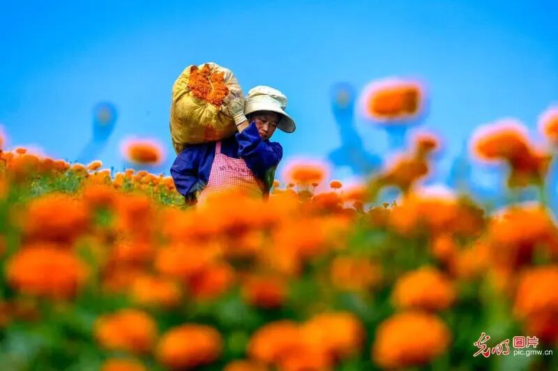2025年8月4日,在云南省红河哈尼族彝族自治州开远市灵泉街道三台铺村,村民搬运刚刚采收的万寿菊。近年来,红河哈尼族彝族自治州开远市灵泉街道充分发挥自身资源优势,在西山片区积极发展万寿菊种植,面积达到1.4万亩,产值超过2500万元,有效促进当地群众增收致富。(张洪科摄/光明图片)